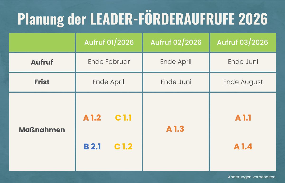 Wir halten Sie regelmäßig mit unserem Newsletter zu den Geschehnissen in unserer LEADER-Region auf dem Laufenden. Wenn Sie über aktuelle Aufrufe, die Entwicklungen bezüglich der neuen Förderperiode 2023-2027, die Verwendung des LEADER-Budgets und weiteres direkt informiert werden möchten, melden Sie sich hier an.