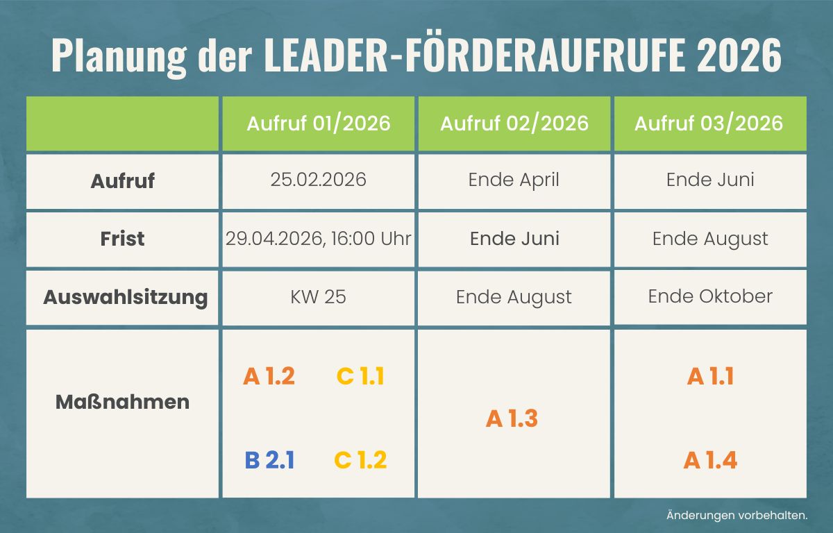 Wir halten Sie regelmäßig mit unserem Newsletter zu den Geschehnissen in unserer LEADER-Region auf dem Laufenden. Wenn Sie über aktuelle Aufrufe, die Entwicklungen bezüglich der neuen Förderperiode 2023-2027, die Verwendung des LEADER-Budgets und weiteres direkt informiert werden möchten, melden Sie sich hier an.